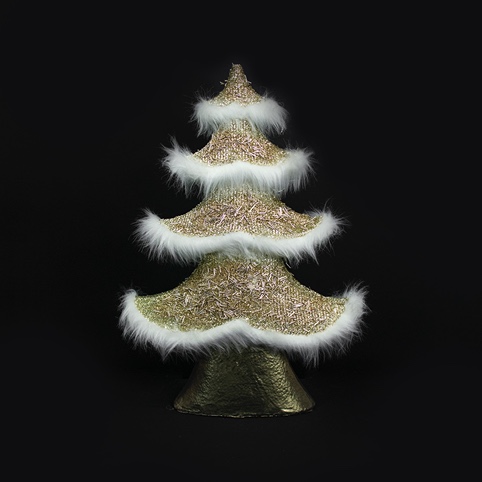 Arbol navideño dorado, icopor. Decorado con tela peluche intercalada y destellos lurex oro. Ideal para adornar el pie del arbol, obsequiar y decorar los diversos espacios de tu hogar.