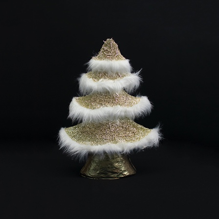 Arbol navideño dorado, icopor. Decorado con tela peluche intercalada y destellos lurex oro. Ideal para adornar el pie del arbol, obsequiar y decorar los diversos espacios de tu hogar.
