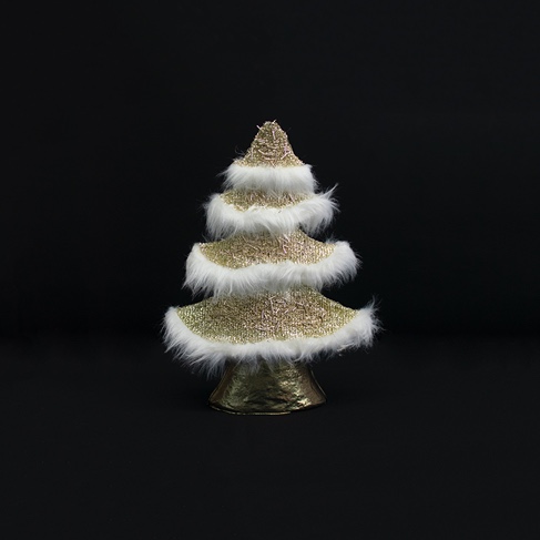 Arbol navideño dorado, icopor. Decorado con tela peluche intercalada y destellos lurex oro. Ideal para adornar el pie del arbol, obsequiar y decorar los diversos espacios de tu hogar.