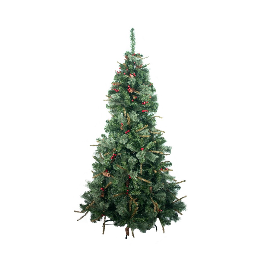 Arbol de navidad Otoño, verde, con berries rojos y piñas, 210 CM. elaborado a partir de plástico reciclado, 100% nacional.