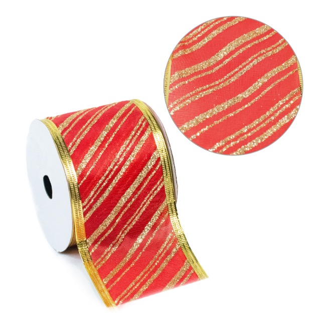 Cinta alambrada navideña, rojo/dorado. De 6.3CM. X 9M. Especial para todo tipo de decoración navideña, empaques y moños.