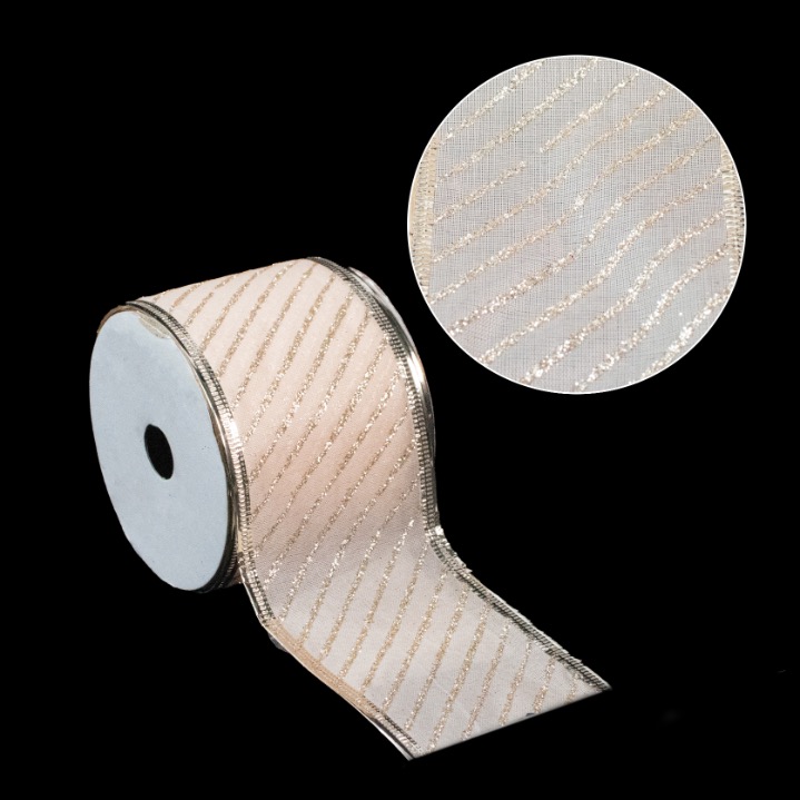 Cinta alambrada navideña champaña, ideal en la elaboracion de moños para coronas, arboles, cortinas, centros de mesa, guirnaldas y obsequios.