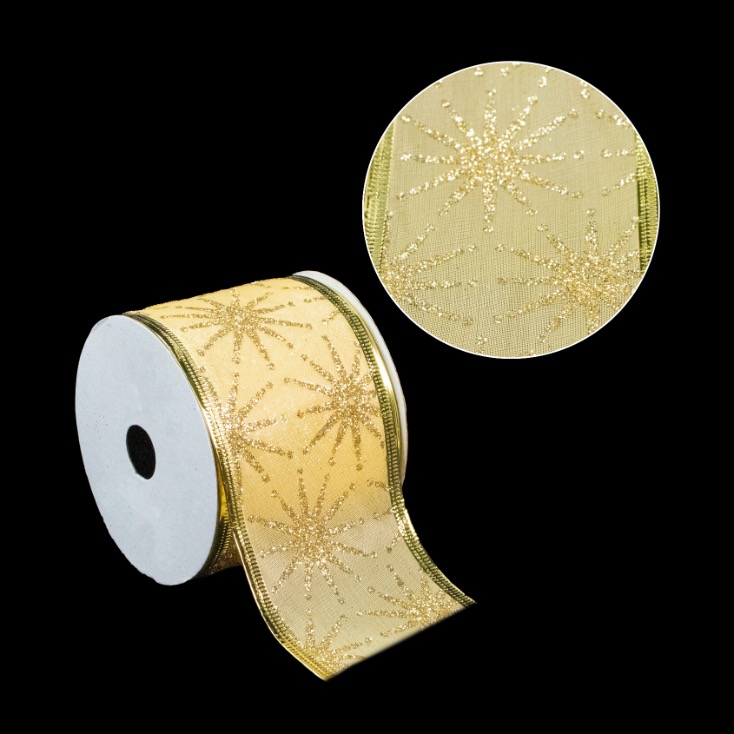Cinta alambrada navideña dorada, ideal en la elaboracion de moños para coronas, arboles, cortinas, centros de mesa, guirnaldas y obsequios.