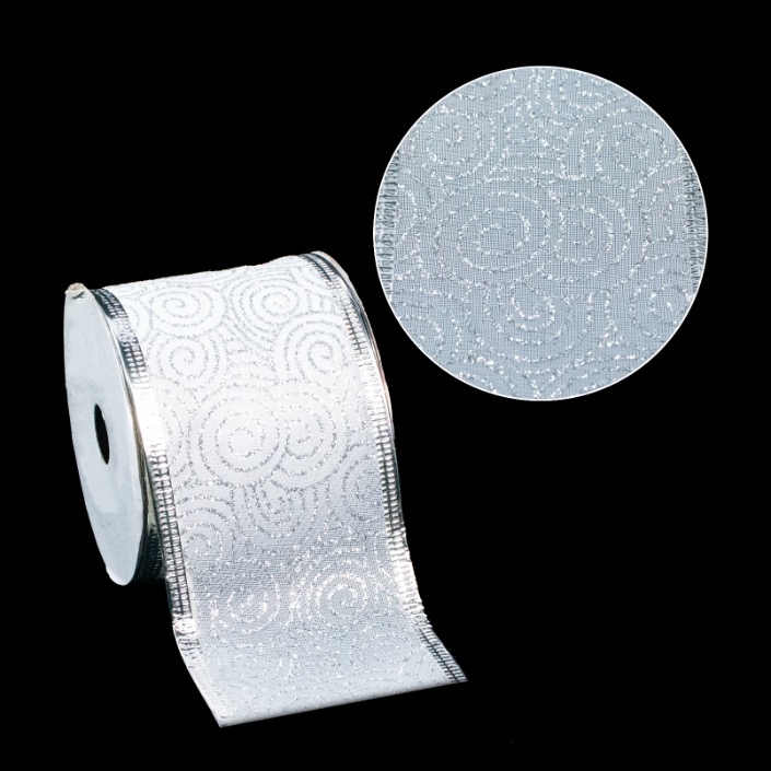 Cinta alambrada navideña plata, ideal en la elaboracion de moños para coronas, arboles, cortinas, centros de mesa, guirnaldas y obsequios.