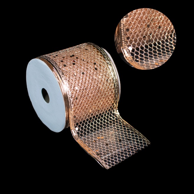 Cinta decorativa alambrada, oro rosa. De 6.3CM. X 9M. Especial para todo tipo de decoración navideña, empaques y moños