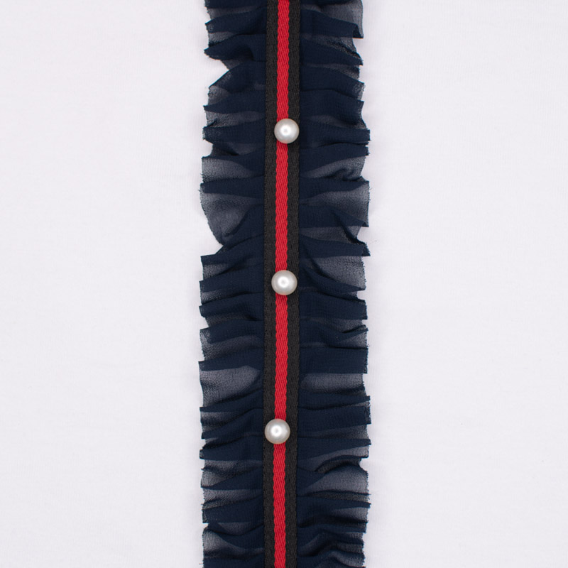 Cinta encaje ruche 50mm. multicolo azul, negro, rojo, 100% poliester, decorativo para la elaboracion de prendas femeninas e infantiles, excelente calidad y textura.