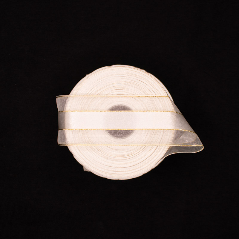 Cinta satin lurex dorado 11/2 blanco 029, composicion 95% nylon y 5% metalico. Ideal para todo tipo de moños, regalos, decoraciones y manualidades.