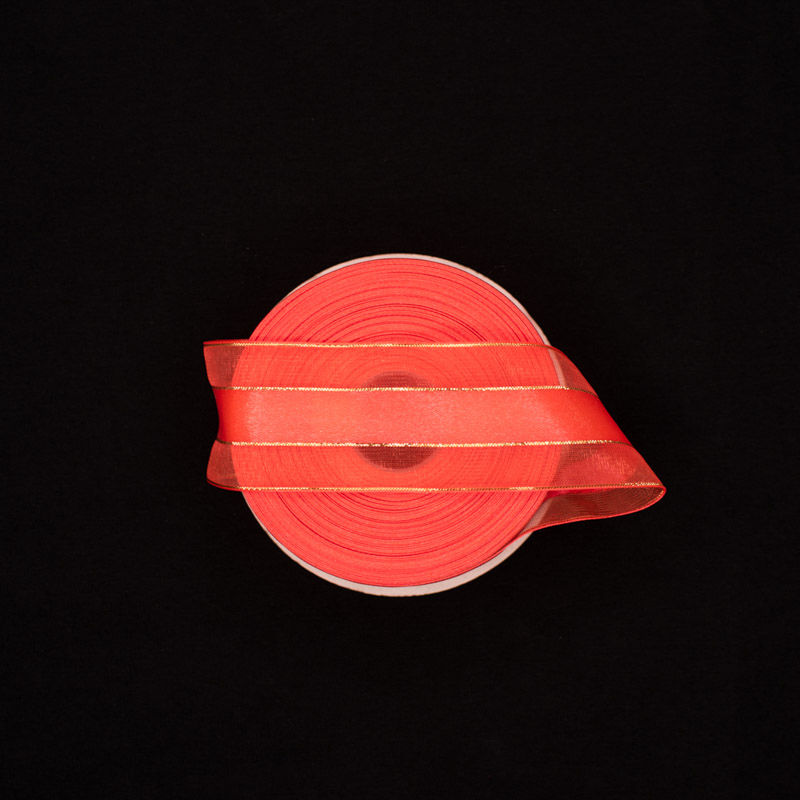 Cinta satin lurex dorado 11/2 naranja S-1, composicion 95% nylon y 5% metalico. Ideal para todo tipo de moños, regalos, decoraciones y manualidades.