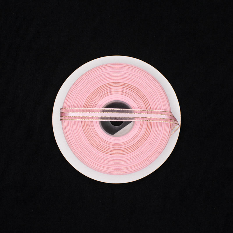 Cinta satin lurex dorado 3/8 rosado claro, composicion 95% nylon y 5% metalico. Ideal para todo tipo de moños, regalos, decoraciones y manualidades.