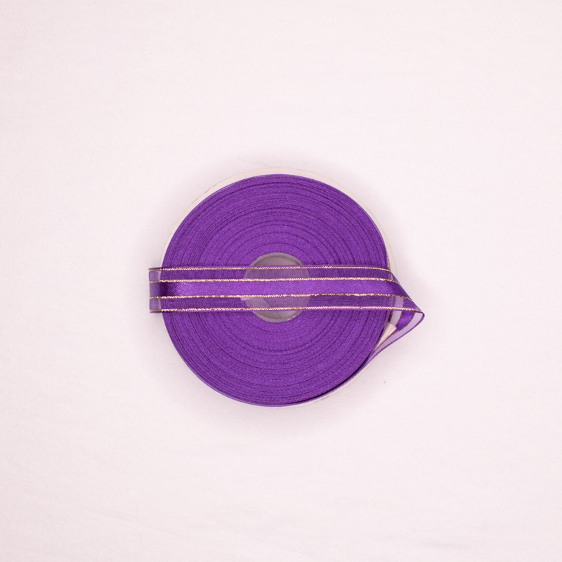 Cinta satin lurex dorado 5/8 morado 465, composicion 95% nylon y 5% metalico. Ideal para todo tipo de moños, regalos, decoraciones y manualidades.