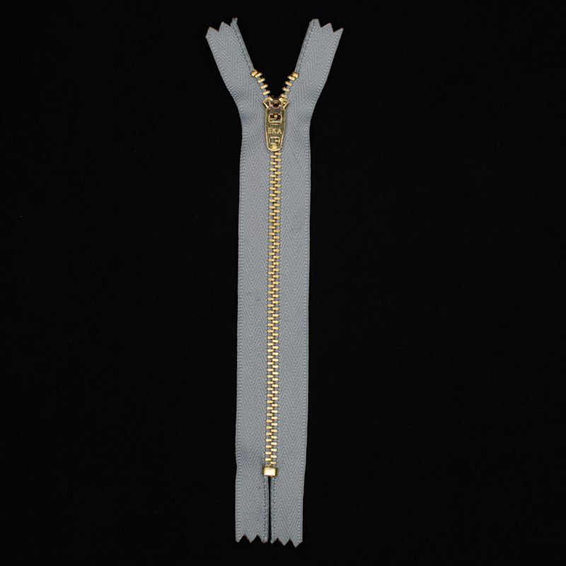 Cremallera cobre 4.5 automatica eka 10cm. gris claro, cinta 100% poliester y fleje laton, especial en el trabajo de prendas pesadas como: jeans, chaquetas, marroquineria y confeccion.