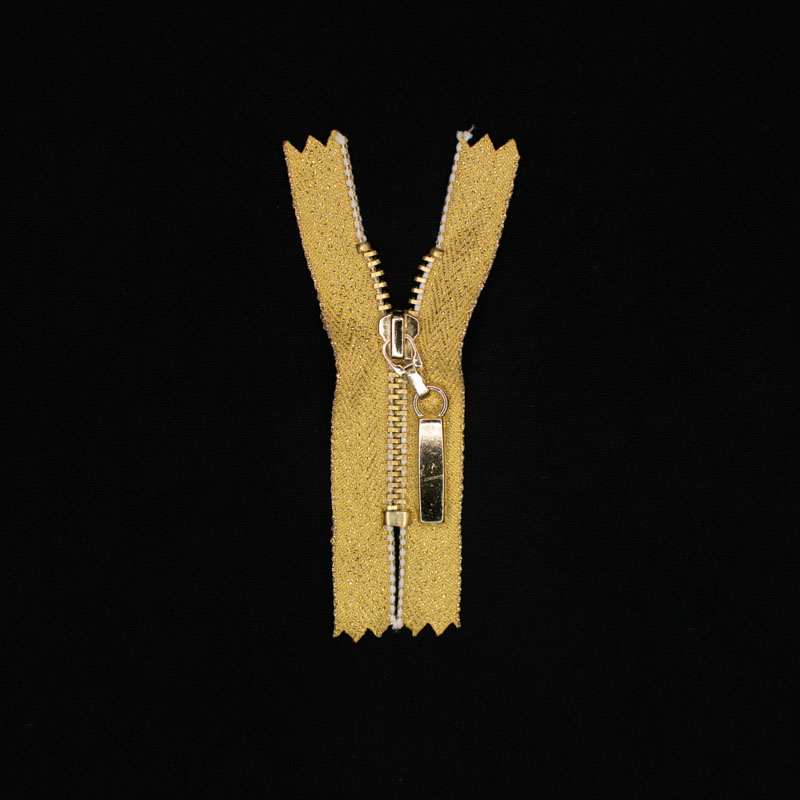 Cremallera cobre 4.5 emblema 6cm. lurex dorado, especial en el trabajo de prendas pesadas como: jeans, chaquetas, marroquineria y confeccion.