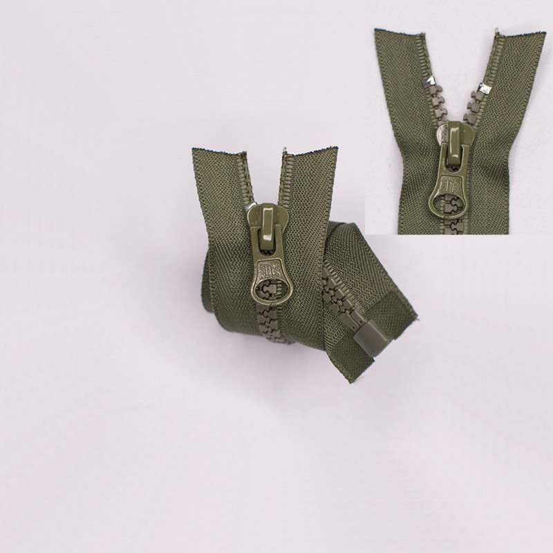 Cremallera delrhin 5.0 separable 40cm. verde oliva, 100% poliester, con extremo superior abierto, excelente calidad y textura, resistente a la humedad, especial para el trabajo de confeccion y prendas unisex, para abrigos, mochilas y cazadoras.