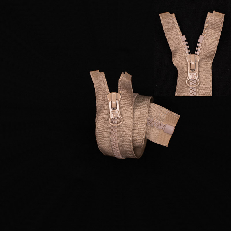 Cremallera delrhin 5.0 separable 65cm. kaki, 100% poliester, con extremo superior abierto, excelente calidad y textura, resistente a la humedad, especial para el trabajo de confeccion y prendas unisex, para abrigos, mochilas y cazadoras.