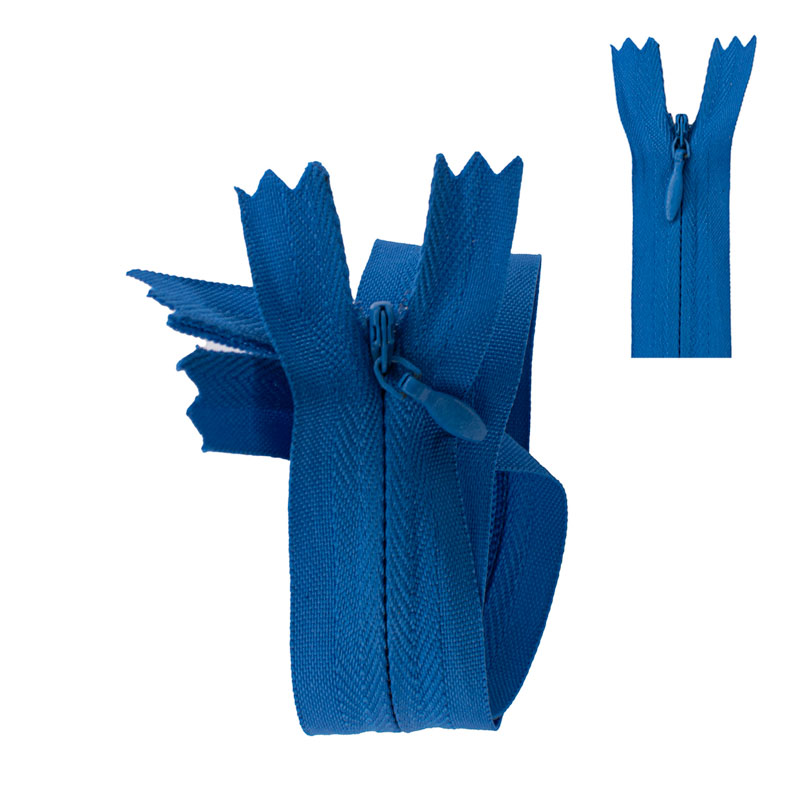 Cremallera invisible 15cm. azul rey, poliester. Especial para confeccion de prendas femeninas e infantiles que requieran ocultar los dientes de la cremallera. Ideal para vestidos, faldas, blusas y cojines. Amplia gama de colores.