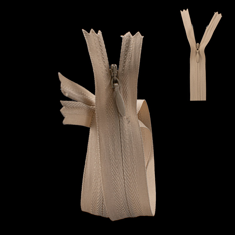 Cremallera invisible 40cm. kaki, poliester. Especial para confeccion de prendas femeninas e infantiles que requieran ocultar los dientes de la cremallera. Ideal para vestidos, faldas, blusas y cojines. Amplia gama de colores.