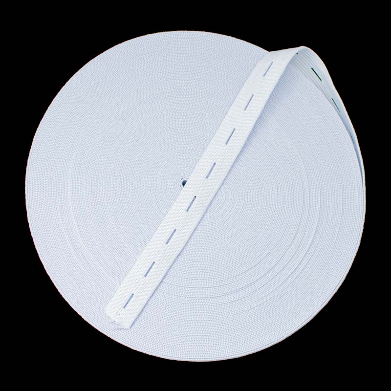 Elástico crochet aurata hueco 20mm. blanco importado, 70% poliester y 30% elastodieno. Especial para el proceso de elaboración de ropa infantil, con ojaletes que facilitan la puesta de botones en tela jean.