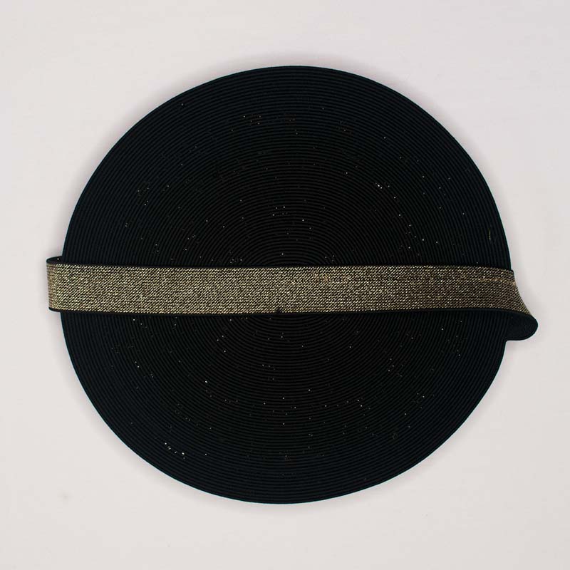 Elástico plano doble faz negro dorado, decorativo con estampado de estrellas para prendas femeninas e infantiles.