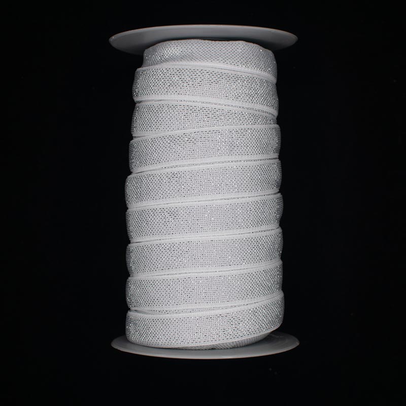 Elástico lurex plata 16mm. crudo, decorativo para prendas femeninas e infantiles, excelente elongación y calidad.