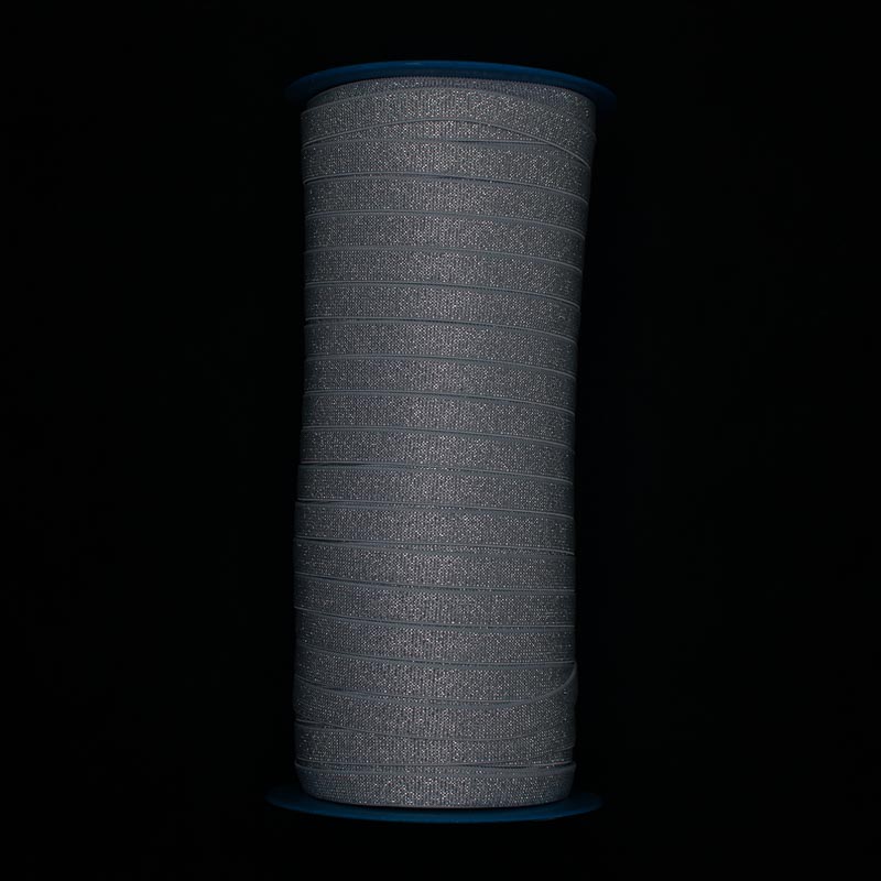 Elástico plano 10mm. gris lurex plata decorativo para todo tipo de prendas, por su flexibilidad y suavidad es usada generalmente en tiras para brasier.