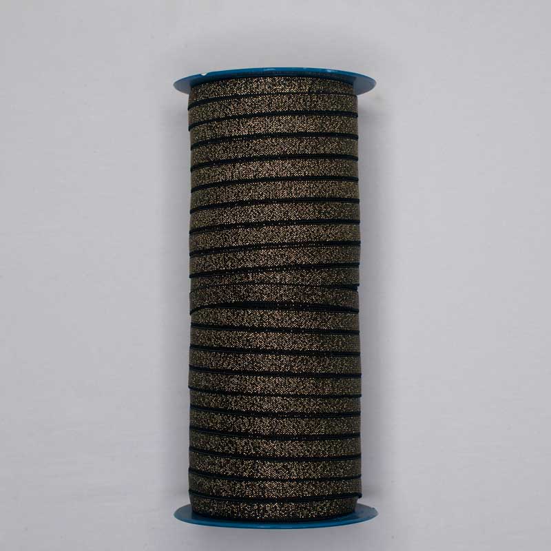 Elástico plano 10mm. negro lurex oro decorativo para todo tipo de prendas, por su flexibilidad y suavidad es usada generalmente en tiras para brasier.