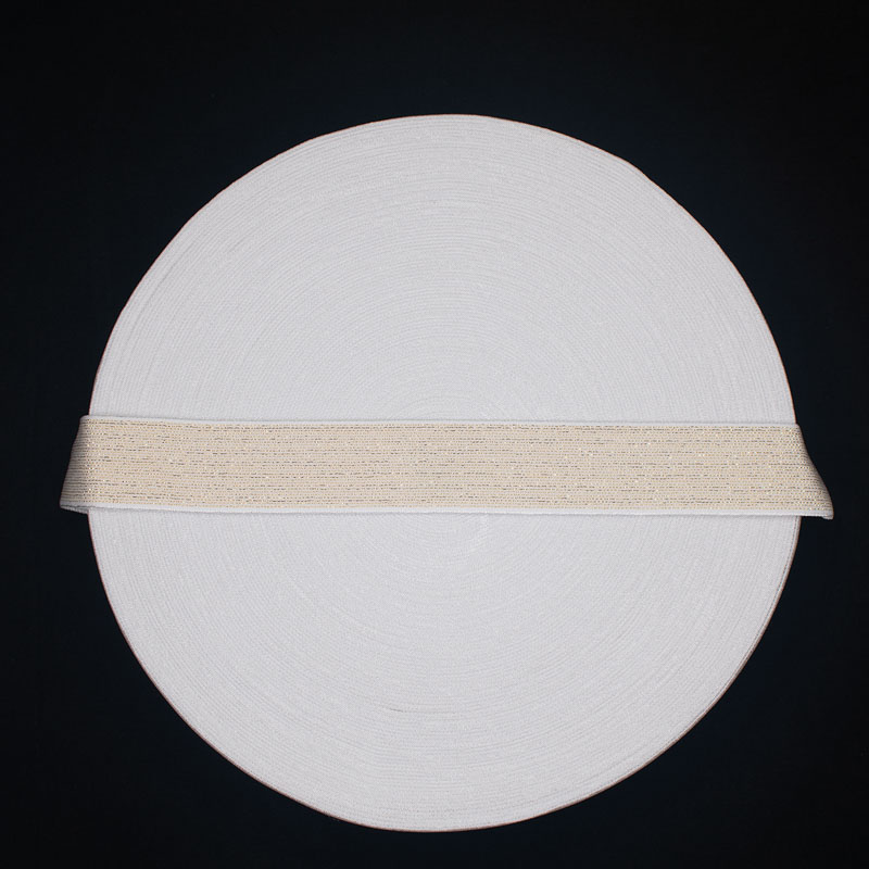 Elástico plano lurex 227/30 30mm. blanco lurex oro, especial para uso externo en prendas infantiles y femeninas.
