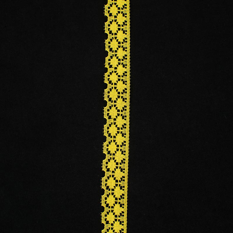Encaje rigido milanito amarillo, poliester. Decorativo para prendas femeninas e infantiles como blusas, vestidos, faldas, decorativo para manualidades y acabados. Ancho: 2CM