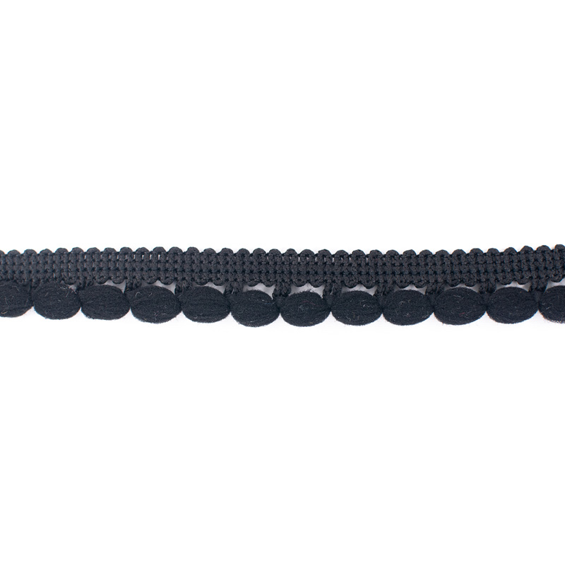 Fleco pompon cerrado negro, poliester. Especial en el trabajo de prendas femeninas e infantiles, decorativo para blusas, faldas, vestidos en general y de danza, cojines, ruanas, salidas de baño y cortinas. De tacto suave y buen movimiento.