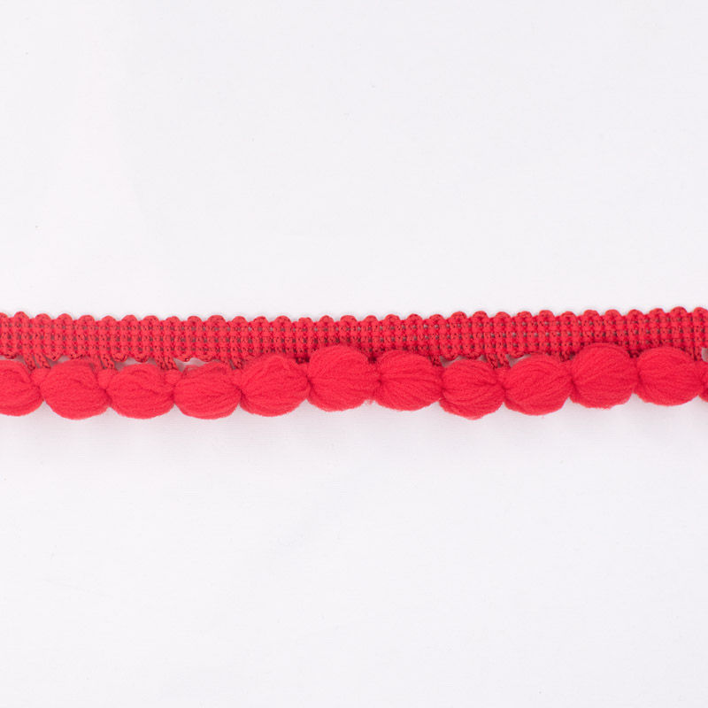 Fleco pompon cerrado rojo, poliester. Especial en el trabajo de prendas femeninas e infantiles, decorativo para blusas, faldas, vestidos en general y de danza, cojines, ruanas, salidas de baño y cortinas. De tacto suave y buen movimiento.