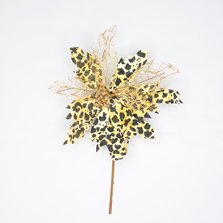 Flor navideña con hojas estampadas animal prins y mallas y adorno central.