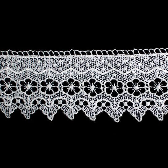 Guipure poliester gpr-34, blanco. Decorativo para prendas femeninas e infantiles de uso expuesto, aplicado en blusas, vestidos, faldas, chaquetas y accesorios. Excelente calidad, textura suave y variedad de estilos.