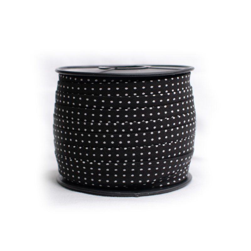Sesgo planchado puntos 16mm. negro, algodon. Decorativo para prendas femeninas e infantiles como blusas, faldas y vestidos, especial para ribetear, envivar, unir, reforzar y cubrir costuras.