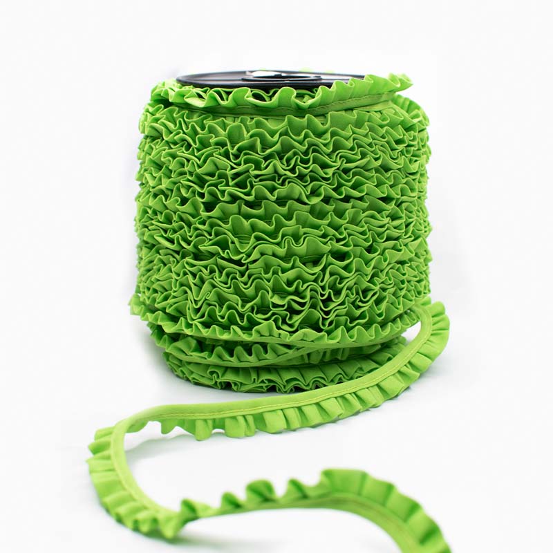 Sesgo ruche verde limon, poliester. Decorativo para prendas femeninas e infantiles como blusas, faldas y vestidos, especial para ribetear, envivar, unir, reforzar y cubrir costuras.