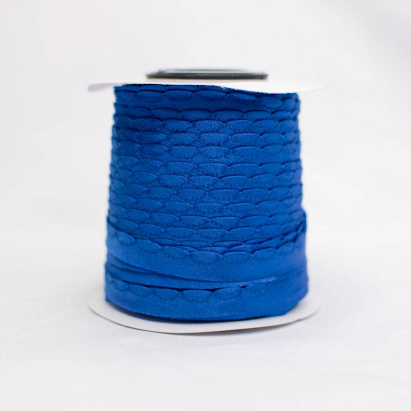 Sesgo satin ondulado azul rey, satinado. Decorativo para prendas femeninas e infantiles como blusas, faldas y vestidos, especial para ribetear, envivar, unir, reforzar y cubrir costuras.