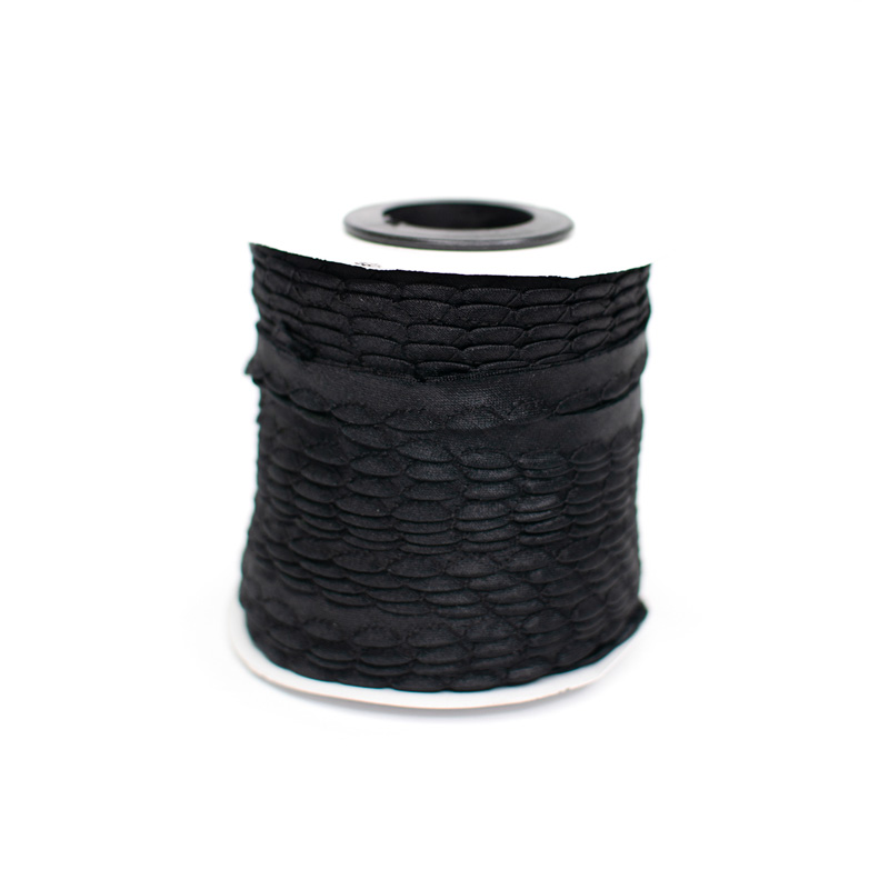 Sesgo satin ondulado negro, satinado. Decorativo para prendas femeninas e infantiles como blusas, faldas y vestidos, especial para ribetear, envivar, unir, reforzar y cubrir costuras.