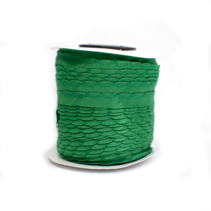 Sesgo satin ondulado verde antioquia, satinado. Decorativo para prendas femeninas e infantiles como blusas, faldas y vestidos, especial para ribetear, envivar, unir, reforzar y cubrir costuras.